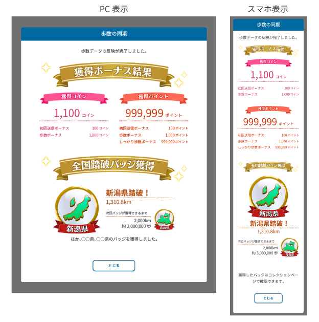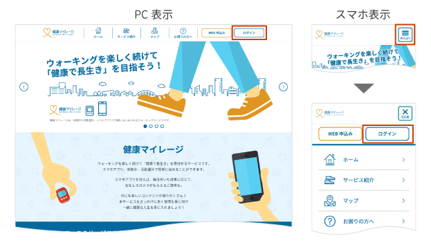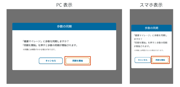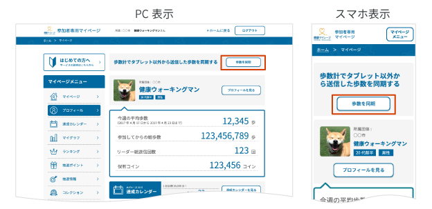 上記の方法で送信した歩数を健康マイレージに同期するには、マイページ内の「歩数同期」ボタンをご利用ください。
