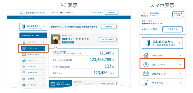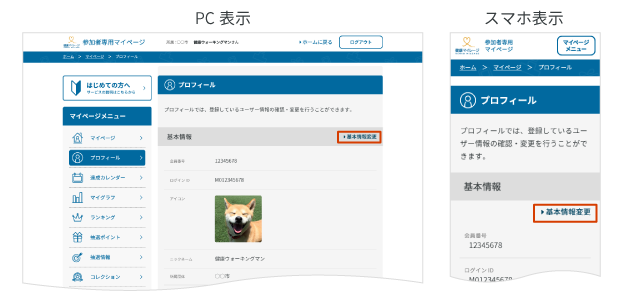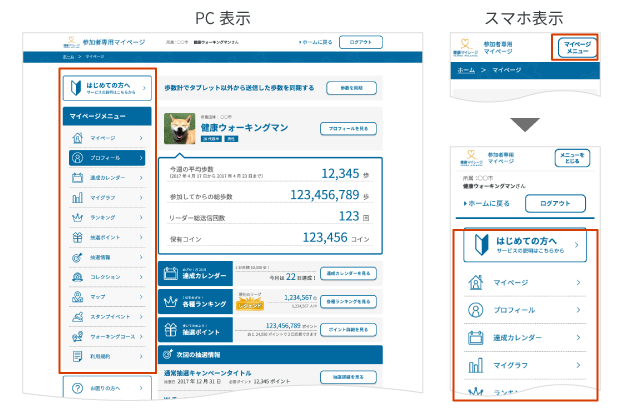 PC表示では左のサイドメニューより、スマホ表示では画面上部「マイメニュー」から、各コンテンツの閲覧、登録情報の変更等が行えます。