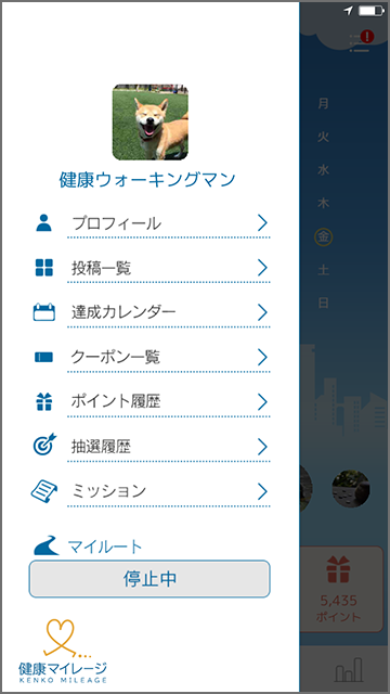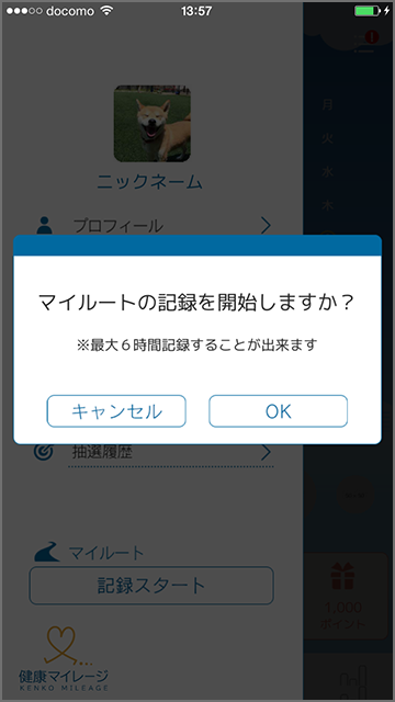 記録を再開する際は、再度マイページ内のボタンをタップして、「再開」を選択します。