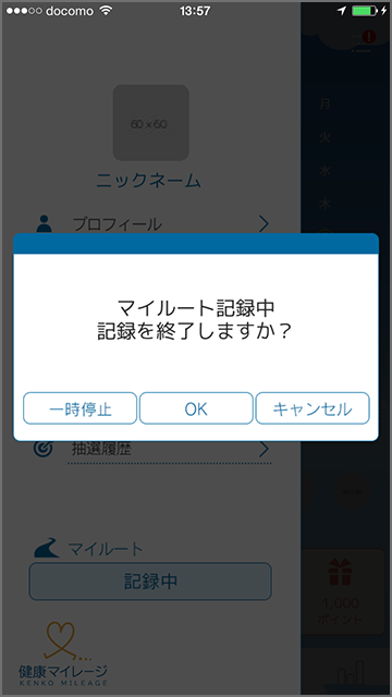 確認ポップアップにて、「一時停止」をタップすれば、記録中のマイルートを一時停止できます。