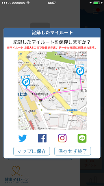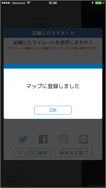 保存確認ポップアップにて、お好みのSNSアイコンをタップで、記録したマイルートを投稿することができます。