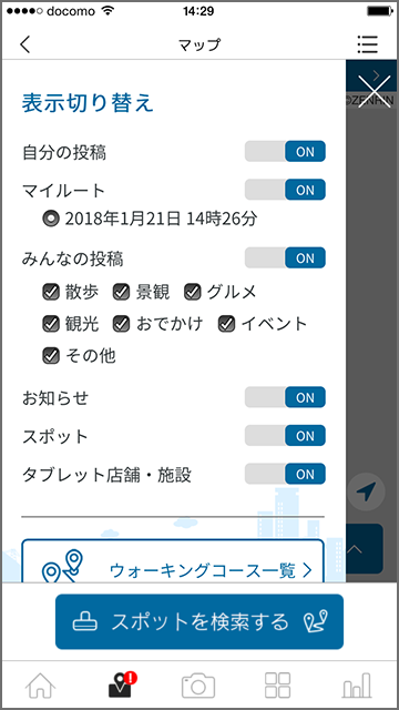 マップメニューの切り替えボタンを操作し、マイルートを表示させます。